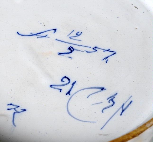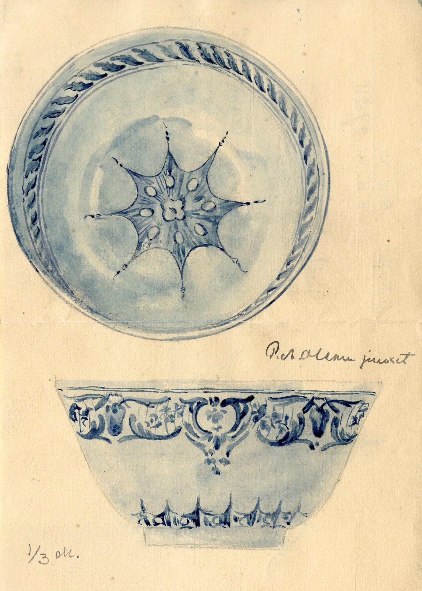 Gråblå glasyr. Dekor i blått och bianco sopra bianco. Dekor ritad av Christian Precht.