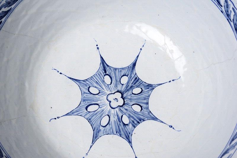 Gråblå glasyr. Dekor i blått och bianco sopra bianco. Dekor ritad av Christian Prechts.