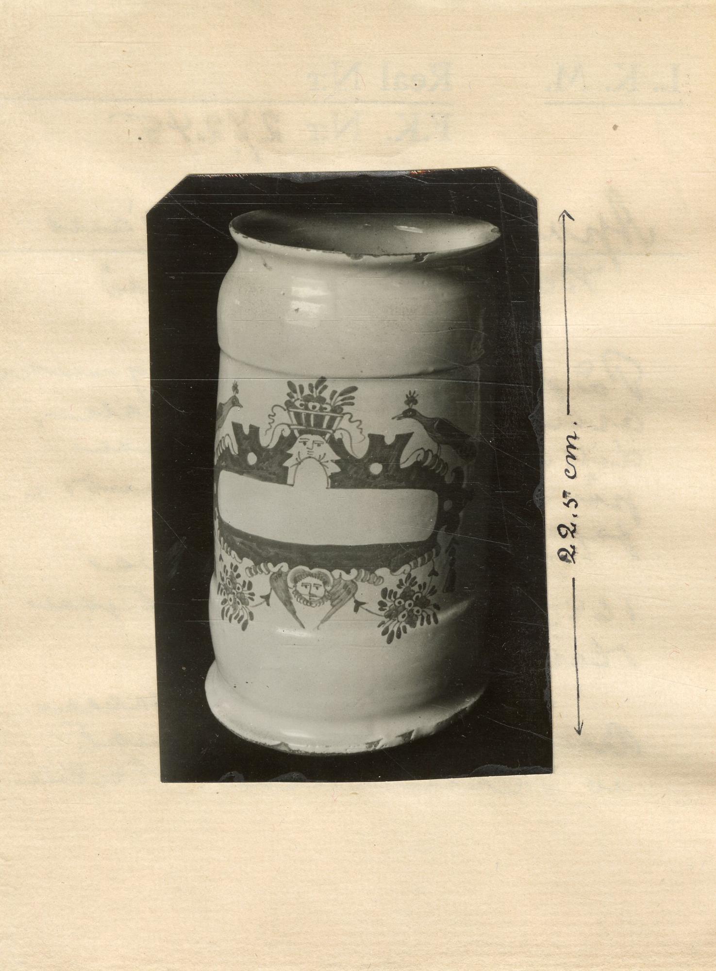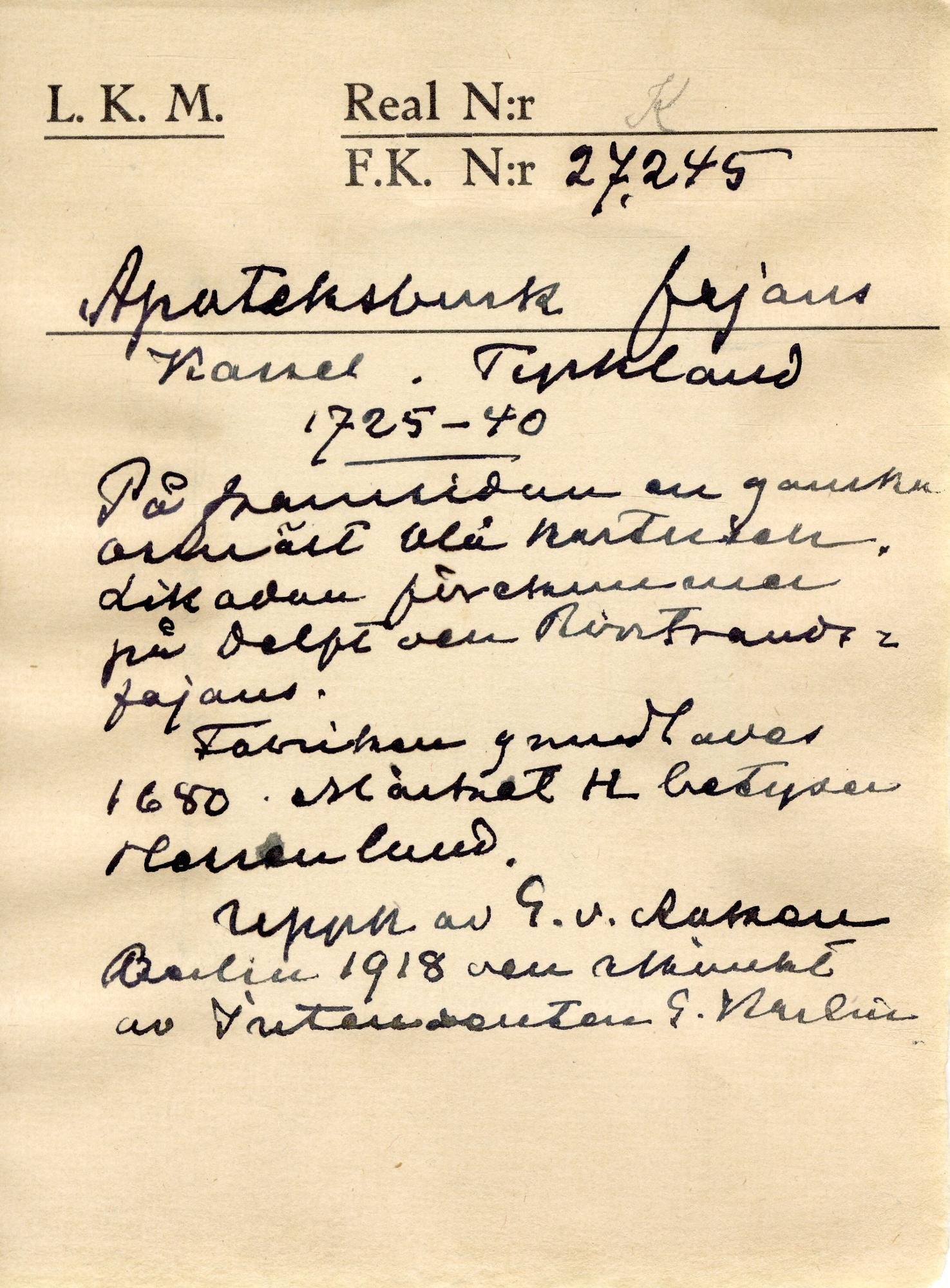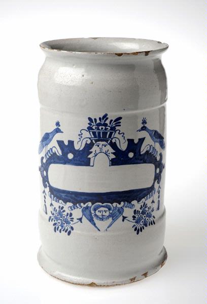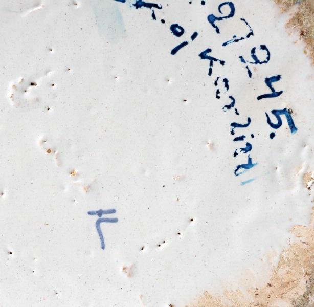 Blå kartusch. Torrt, glanslöst måleri. Dåligt bränt? överglasyr.