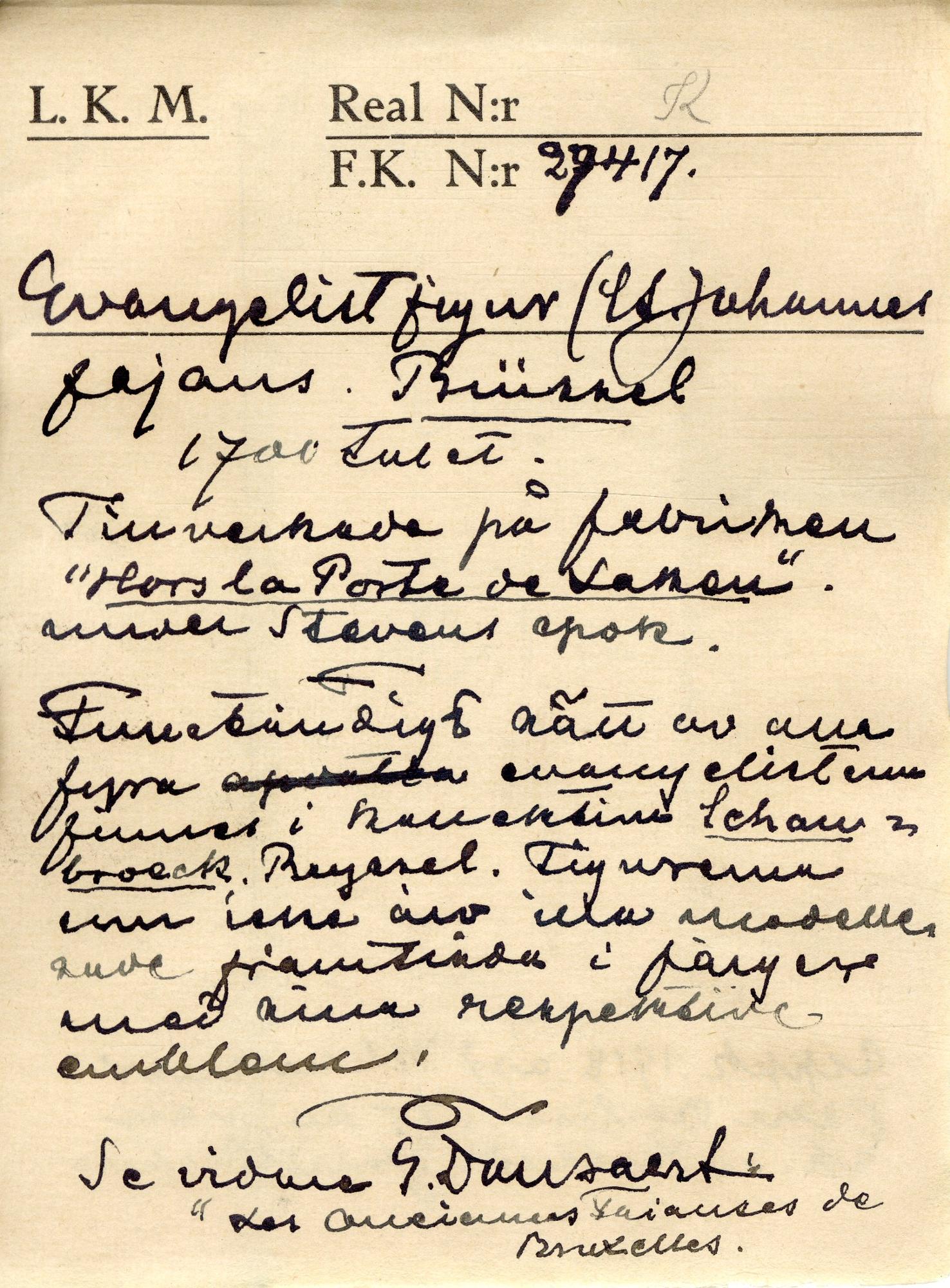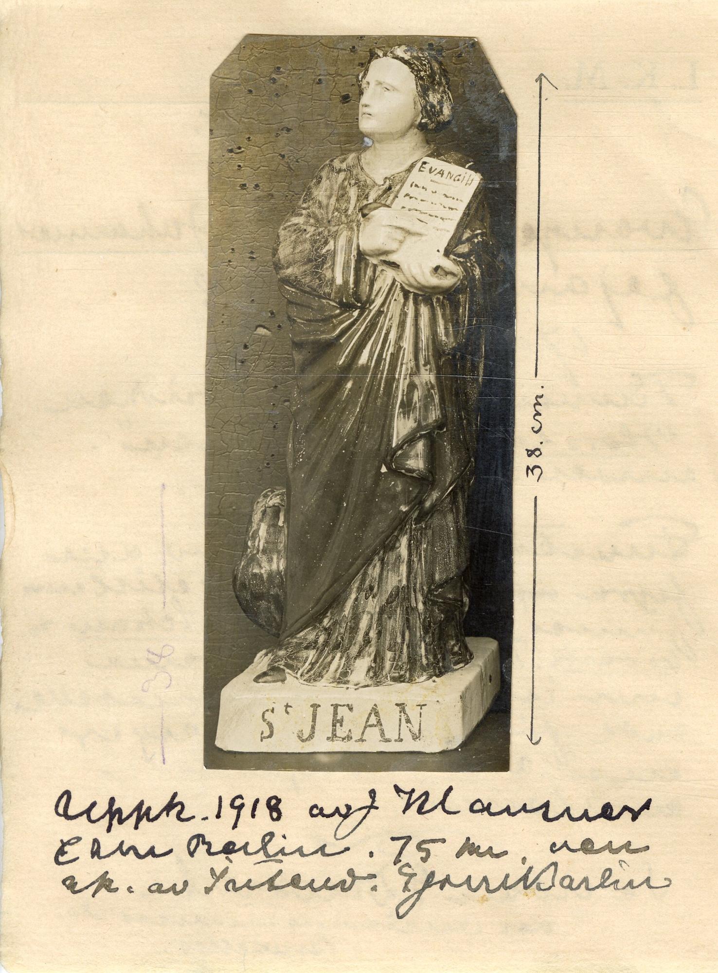 - Mansfigur iklädd lång dräkt i rödaktigt mangan. Gul mantel över ena axeln. I ena handen håller han ett papper på vilket han skriver med den andra, text "EVANGILI". Vid hans fötter sitter en stor fågel. Står på låg sockel med text "St JEAN".