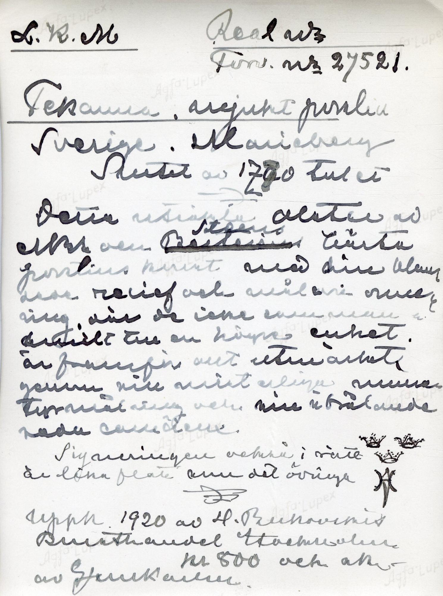 signerad: tre kronor/......... i rött [avritad på katalogkort]