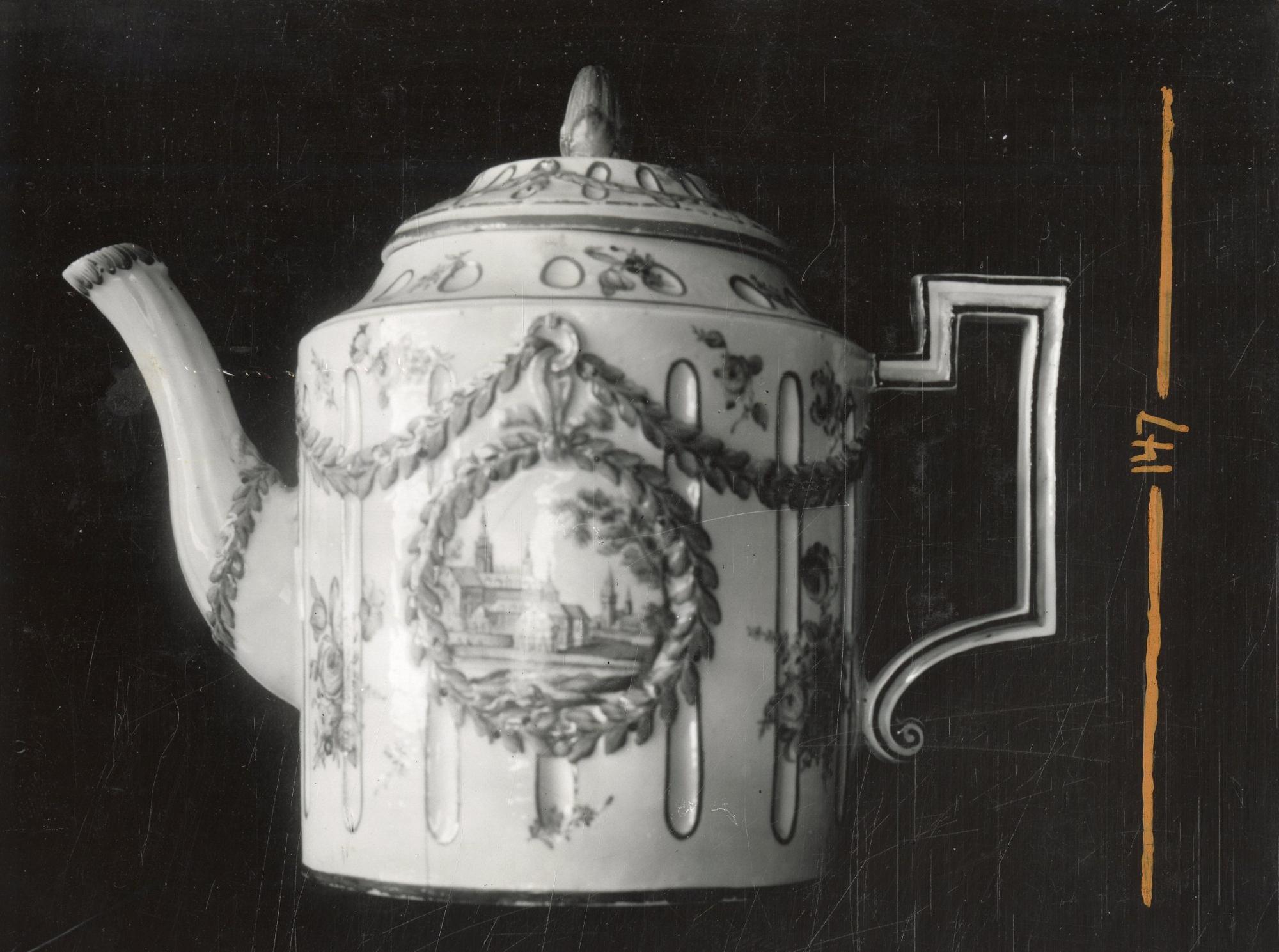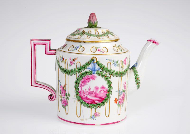 Polykrom dekor, ornerad med miniatyrlandskap, girlander med mera.