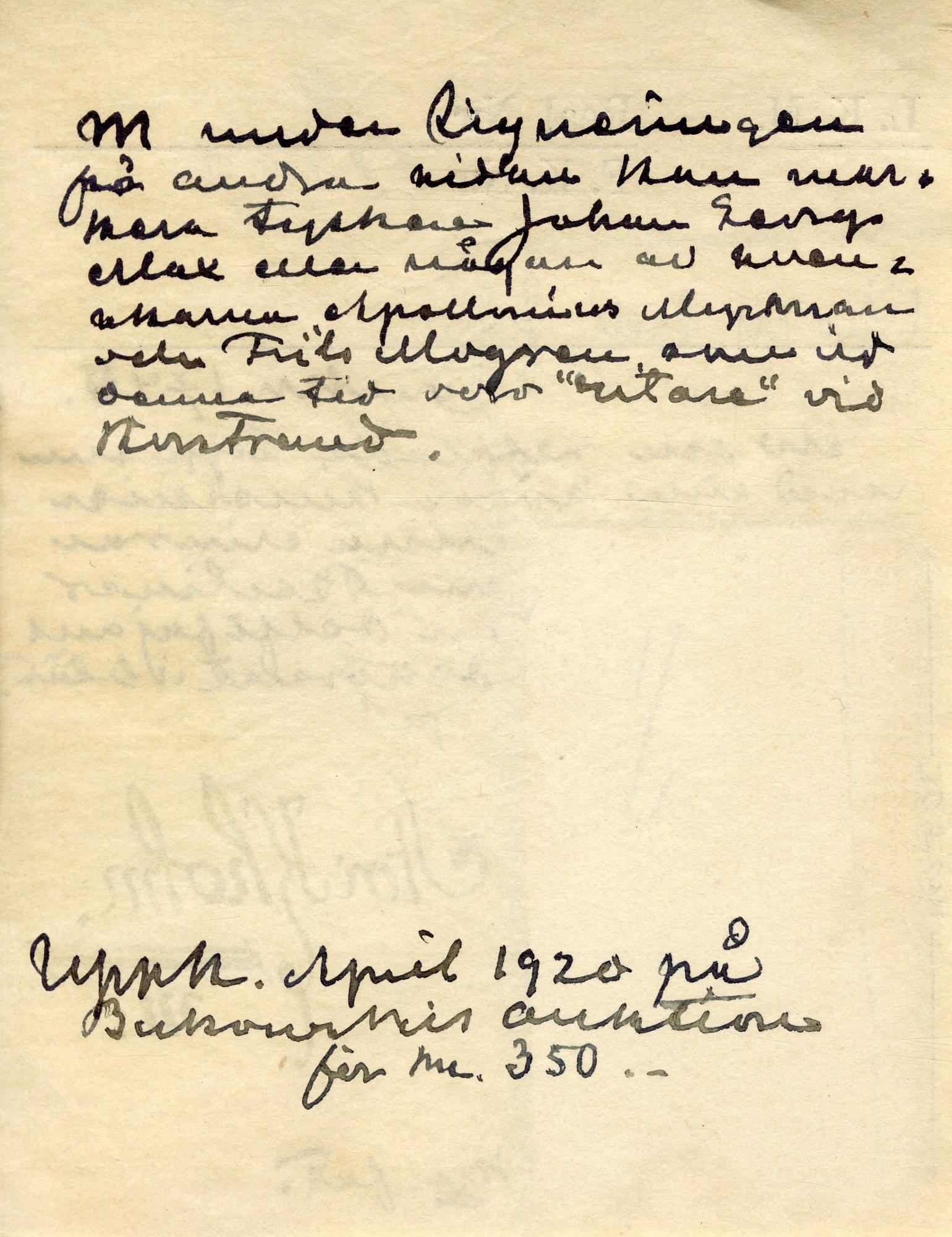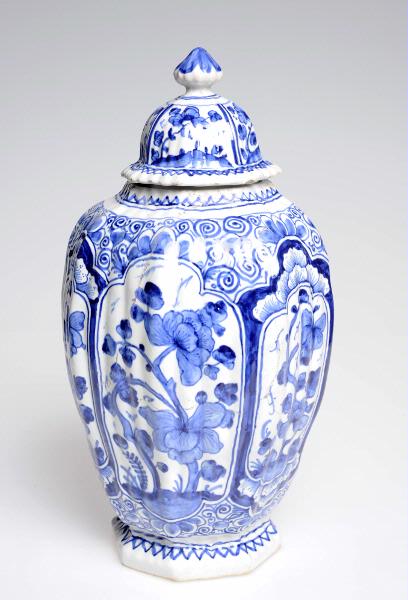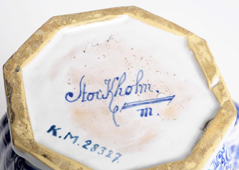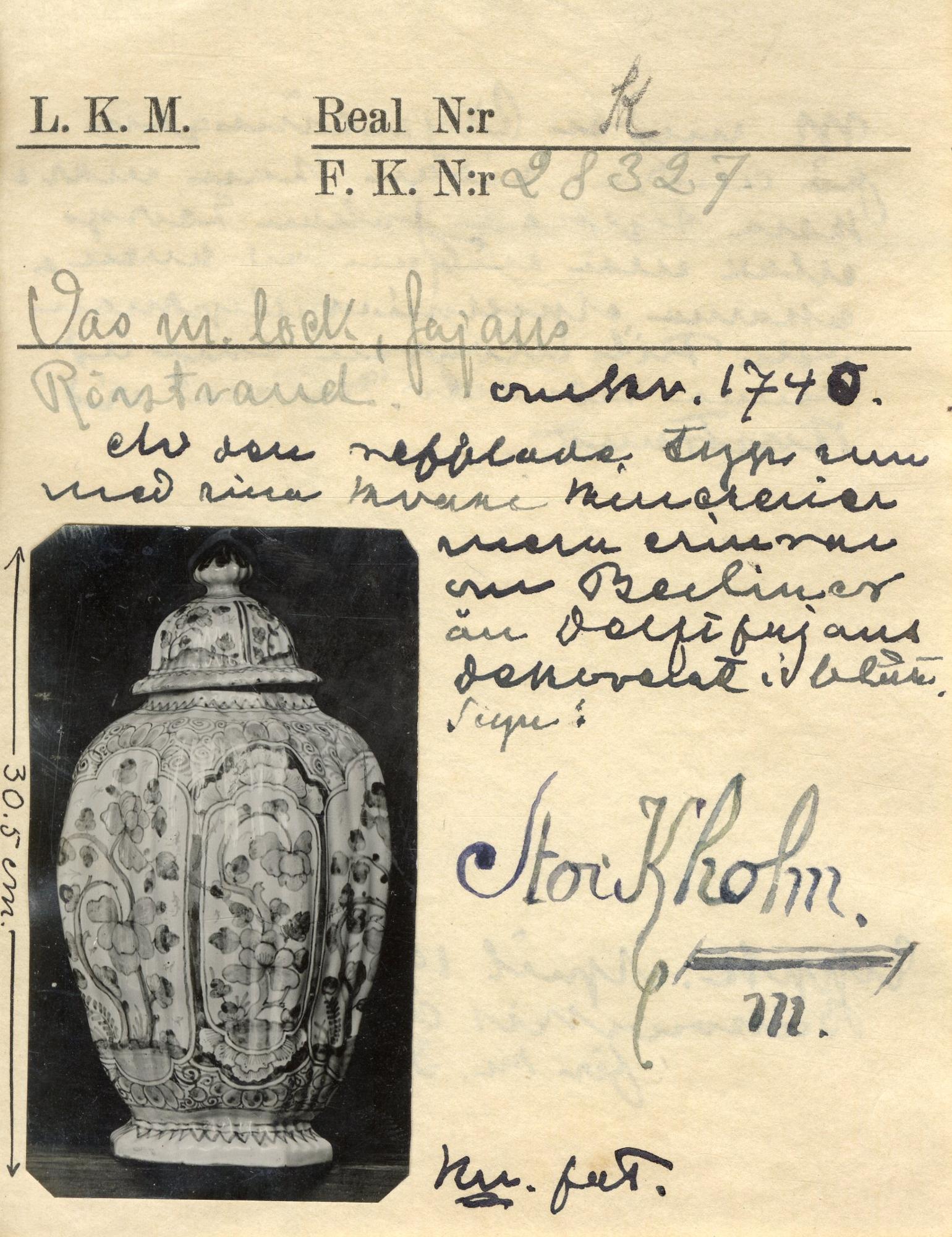 "Den avbildade urnan skulle gott ha kunnat vara gjord i Delft, där liknande tillverkades i serier för att placeras som uppsatser på skåp eller spiselhyllor. Nu bär den i vacker signatur sin tillkomstorts namn - Stockholm - och därunder ett m. Vid Rörstrand brukade man signera med Stockholm ända fram till kokurrentfabriken Mariebergs grundläggning 1760 , då man övergick till att skriva Rörstrand. m synes nu antyda, att dekorationen utförts av den duktige keramikern ANDERS FAHLSTRÖM, vilken hade fabrikens konstnärliga ledning omhand från omkr. 1740 till sin död 20 år senare."