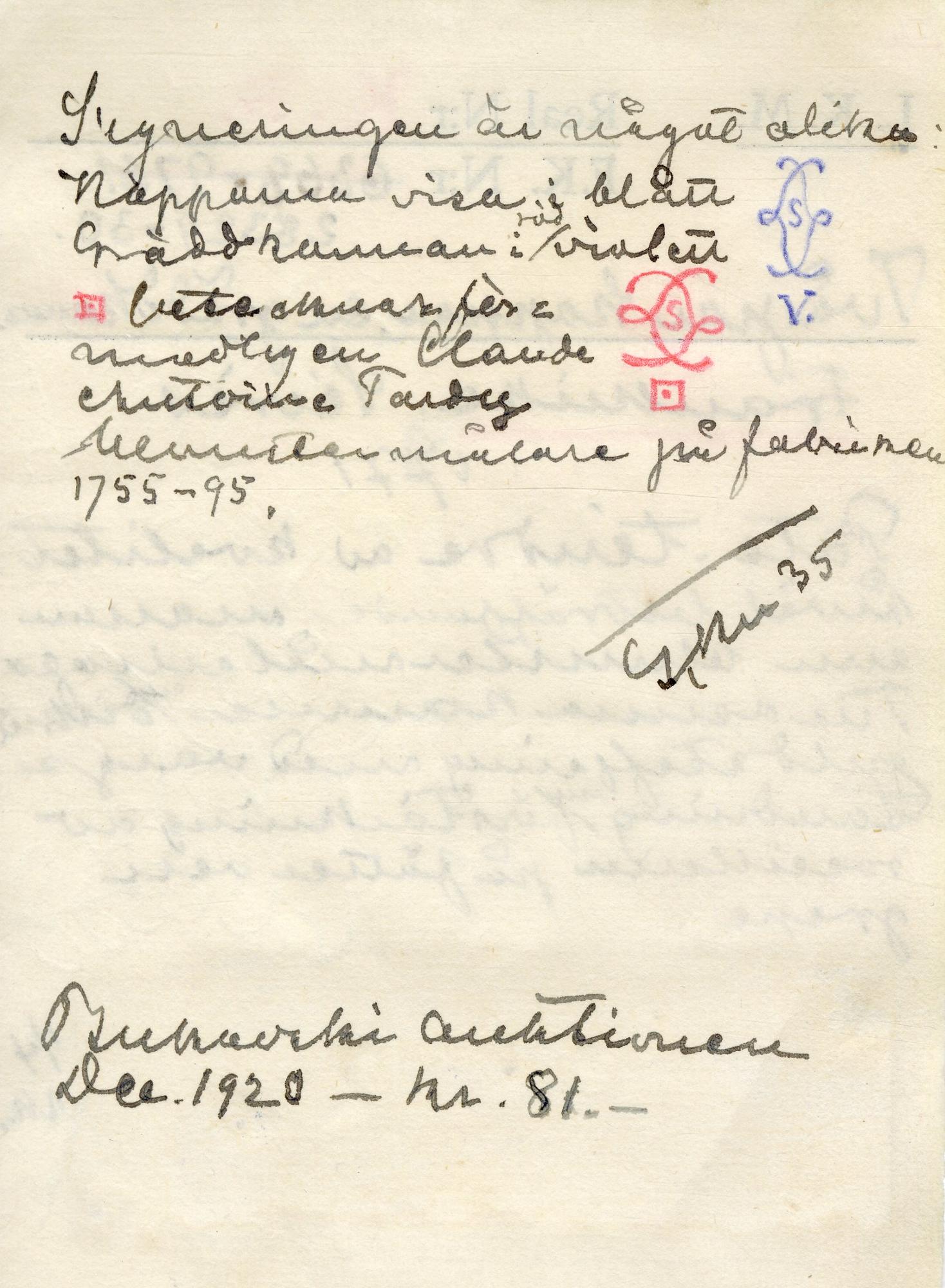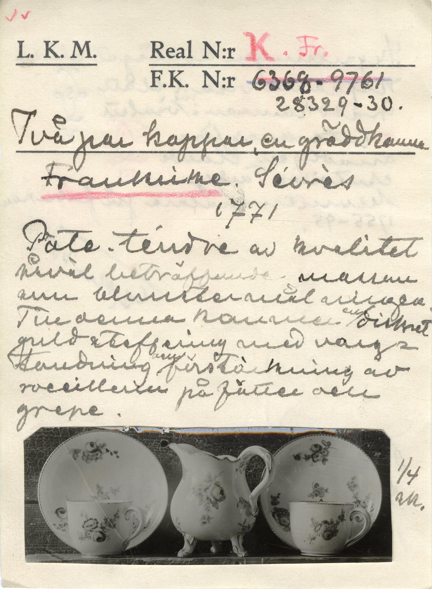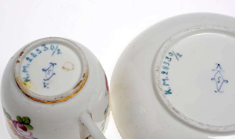 I blått över glasyr i såväl koppar som fat Sèvres fabriksmärke samt V. i ena koppen ristat 205 samt en kvad5rat med X [avbildat på katalogkort] i fatet tre streck [avbildat på katalogkortet] i den andra koppen samt det tillhörande fatet ristat 2 [avbildat på katalogkort].