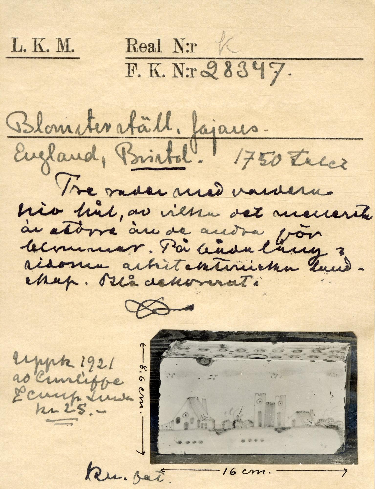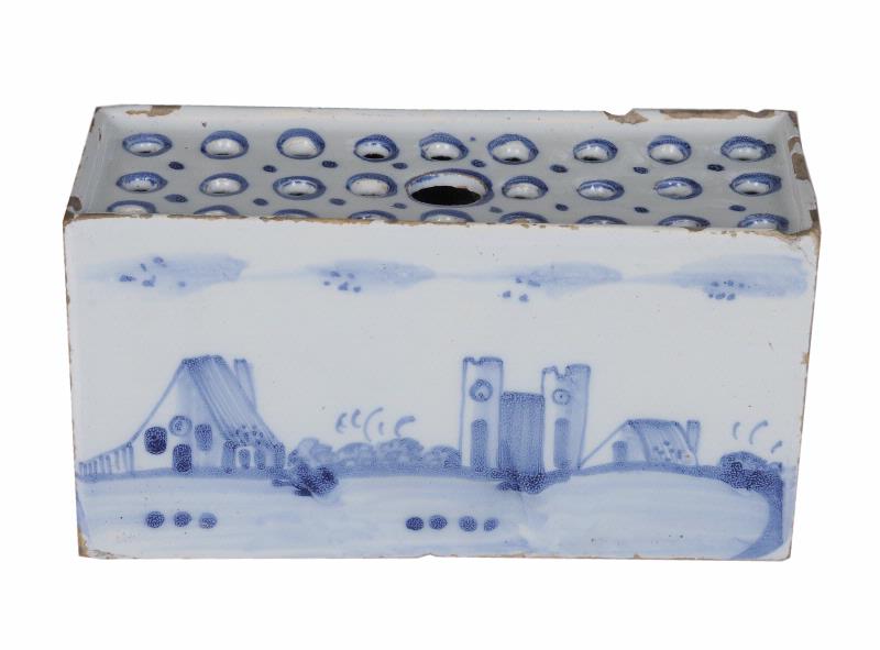 Blå dekor, arkitektoniska landskap på långsidorna, på ovansidan tre rader med nio hål i varje för blommor.