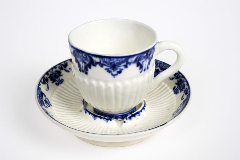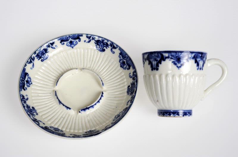 Mjukt porslin. Räfflad yta med blå ornament dekor runt kant och fotring.
