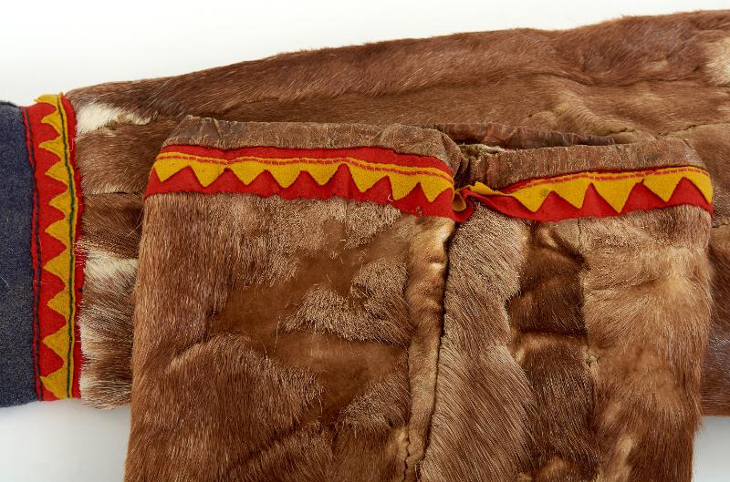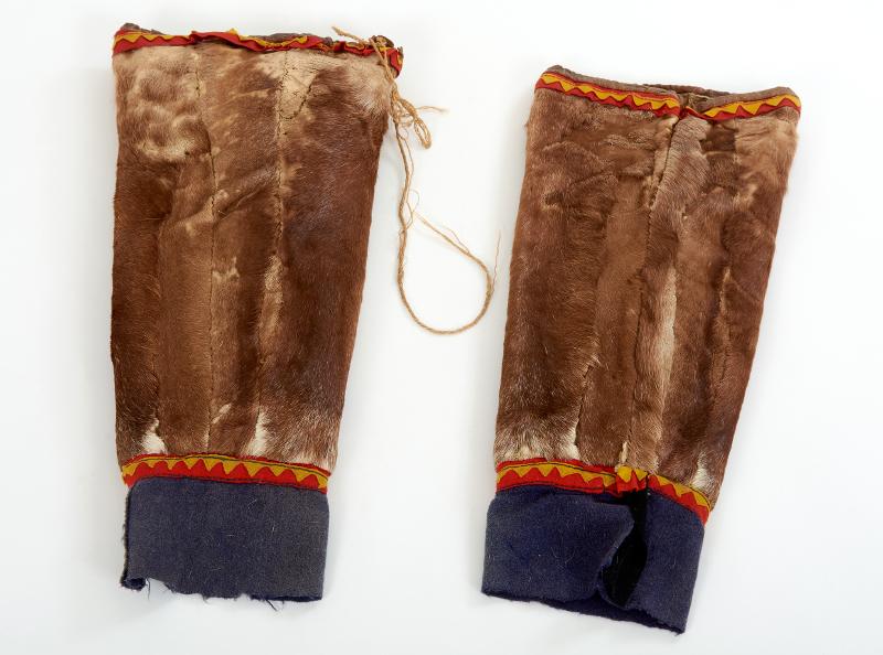 Benskydd av renskinn. Dekorerat med röda och gula bårder av ylletyg klippt i flikar. Nededel av blå vadmal.