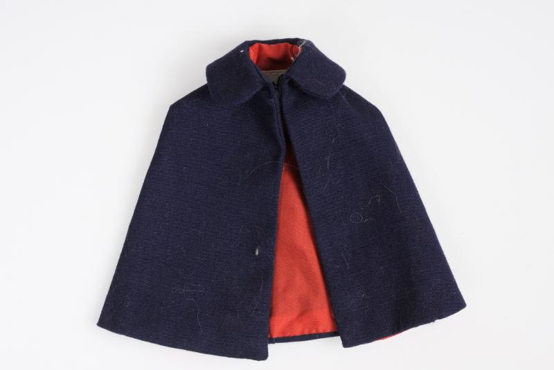 Öppen fram med nedfälld krage och en plastknapp i halsen. Marinblå med rött foder.