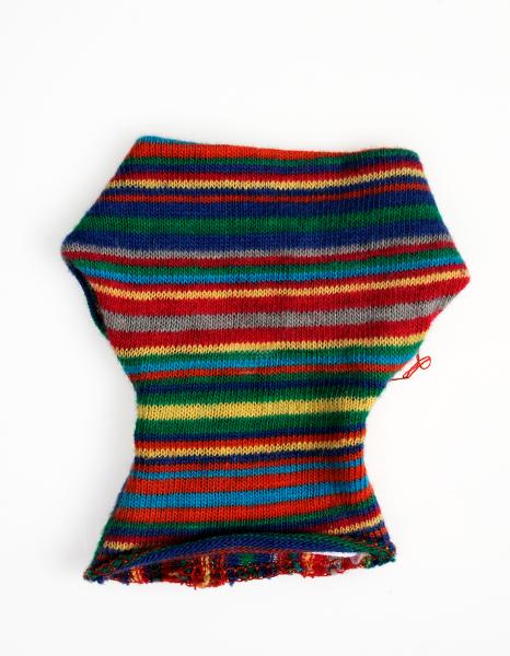 Tvärrandig fram och långrandig bak, flerfärgad. Kort ärm, hög hals fram och djupt v-ringad bak. Rak skärning i hals. Har tillhörande blå halsduk med frans.