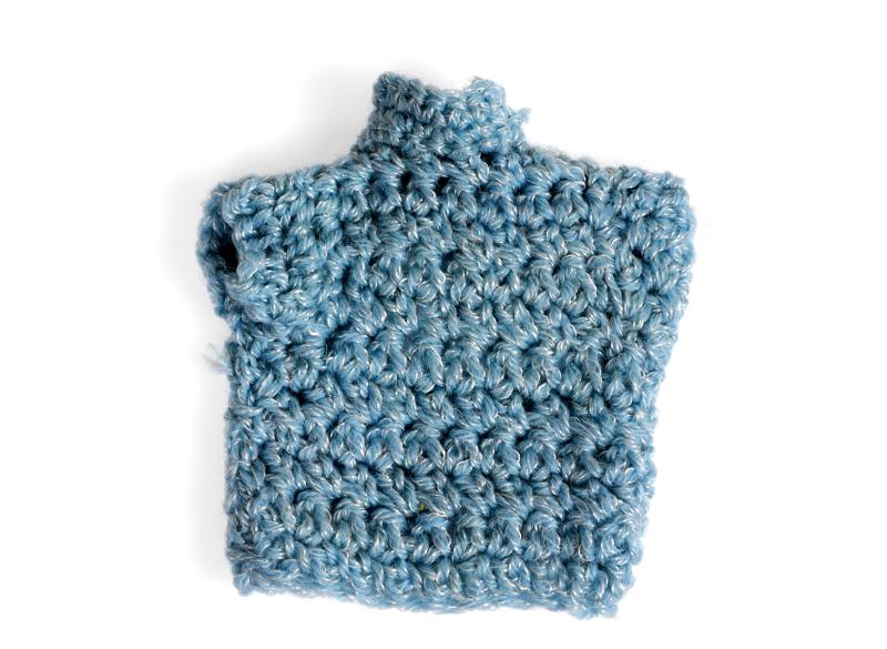 Hög hals. Ljusblå med vita inslag. Delvis öppen bak i v-ringning, med knäppning halsen.