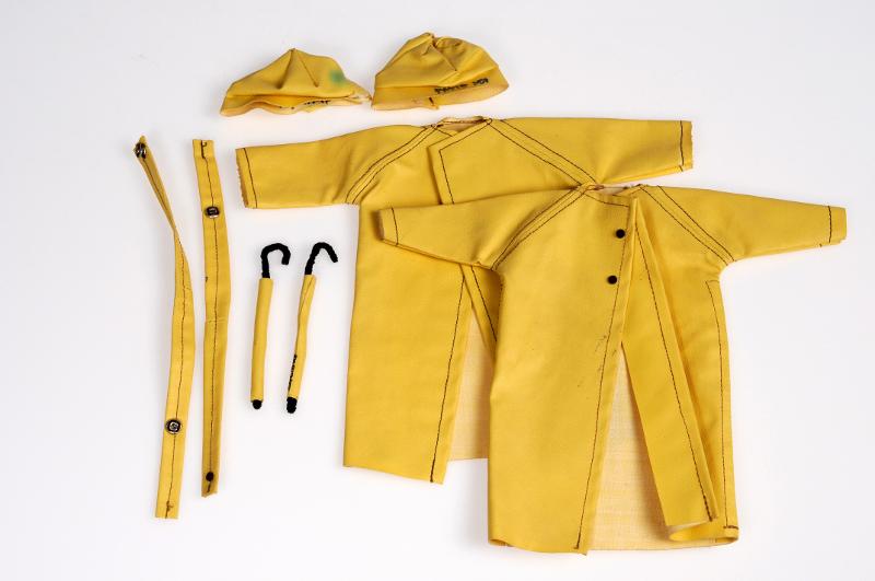 - Jackor ljusgula med bruna sömmar. Två bruna knappar fram som dekoration. Utan krage. Tillhörande skärp med knäppning. Regnmössa med skärm respektive bred nederkant. Paraply svart. Jackorna och mössorna är märkta B respektive M på insidan med bläck.