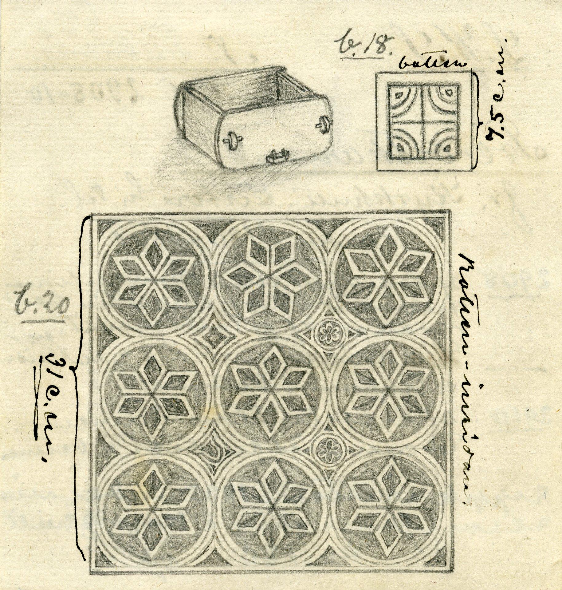 Kvadratisk. I bottnen skuret geometriskt mönster. Gavlarna enkeltappade i långsidorna, tappningarna vågrätt enkelreglade med träsprintar. Bottnen enkeltappad i långsidorna, tappningarna lodrätt dubbelreglade. I bottnens undersida utskuret: