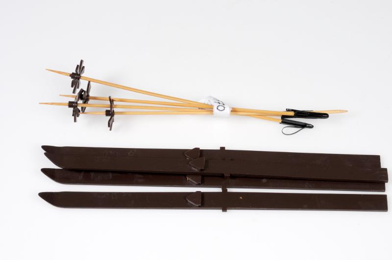Bruna med tillhörande stavar. Skidorna är släta med mindre fäste för pjäxan. Stavar med brun plastring nedtill och svarta handtag upp. Ett handtag saknas.