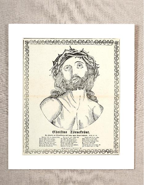 Bilden är ett porträtt av Jesus med törnekronan på huvudet, och det omges av en bred bård prydd med en girlang.
