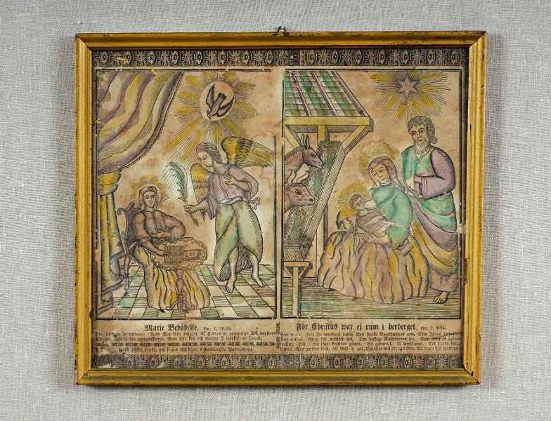 Bild 1- Marie Bebådelse. Till vänster på bilden sitter jungfru Maria vid ett bord med handen på en uppslagen bok, och en ängel sträcker fram en palmkvist mot henne. Ovanför ängeln svävar en duva och till vänster om Maria hänger ett stort draperi.