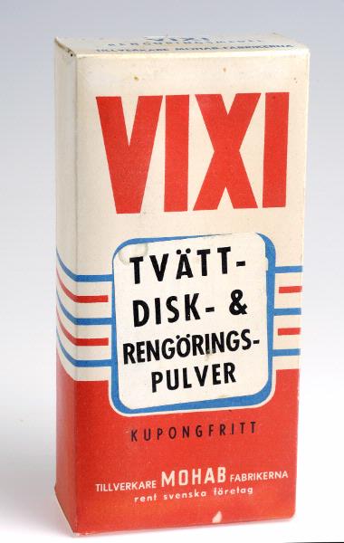 - Förpackning med rengöringsmedel med tryck i rött, blått och svart på vit botten. På framsidan texten: VIXI TVÄTT-DISK- & RENGÖRINGSPULVER, KUPONGFRITT, TILLVERKARE MOHAB FABRIKERNA, rent svenska företag. På baksidan en bruksanvisning för disk och rengöring.