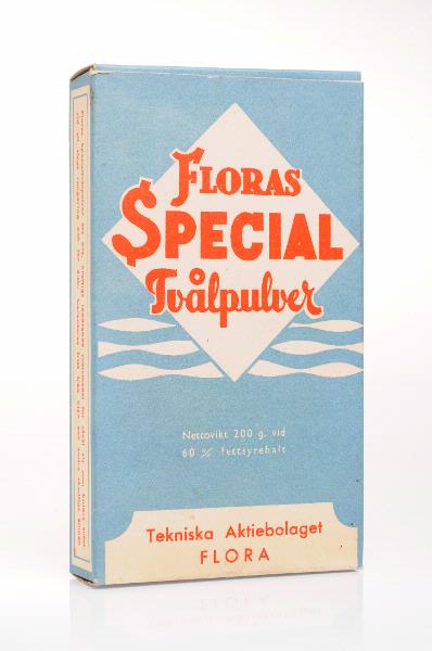 Förpackning med tvättmedel med tryck i rött och blågrönt. På framsidan texten: FLORAS SPECIAL Tvålpulver, Tekniska Aktiebolaget FLORA. På baksidan ett tvättrecept och texten: Tekniska Aktiebolaget FLORA GÄVLE.