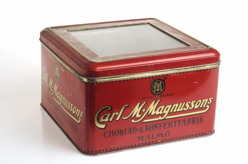 kvadratisk med glas i locket; röd med text i guld: Carl M Magnussons choklad&konfektfabrik Malmö