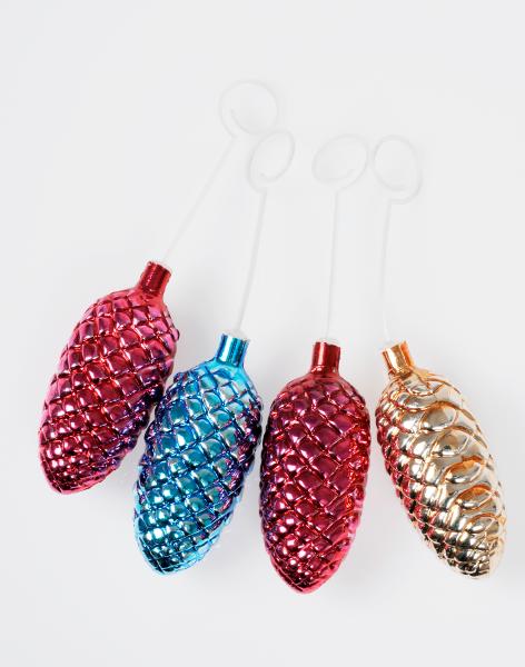 I metallfärger: blå, gul och två röda; plastupphängning med ögla.
