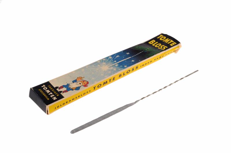 Rektangulär förpackning med tryck i flera färger. Överst på framsidan texten TOMTE BLOSS. Nedanför ett gnistrande tomtebloss som hänger i en grankvist. Under tomteblosset en tomte som står med ett höjt pekfinger. Under tomten texten: FABRIKEN TOMTEN STOCKHOLM. På långsidorna texten: JULGRANSBLOSS TOMTEBLOSS INREG. VARUMÄRKE. På baksidan en informationstext.