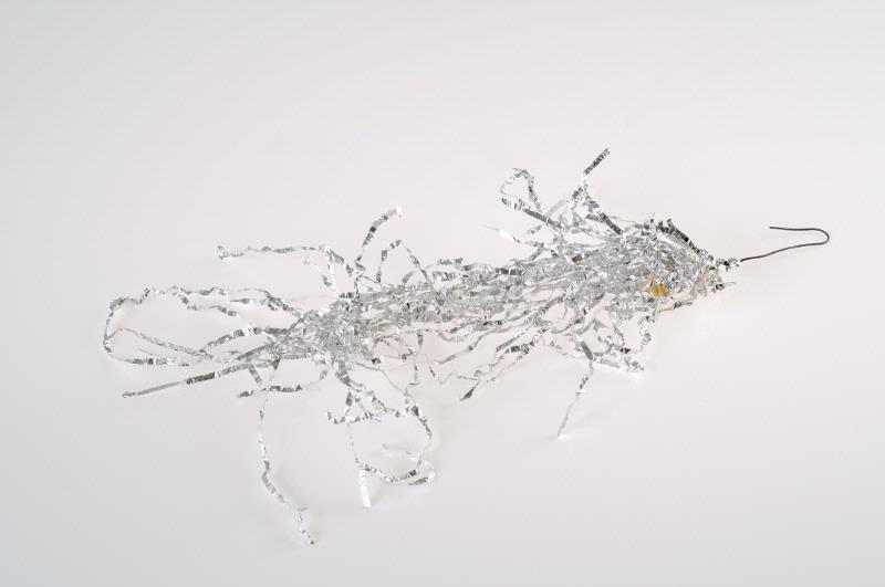 Skrynkligt silverglitter(konstmaterial) i fransar på en krok. Förvaras i en brun pappkartong med texten GLITTER STJÄRNA på locket.