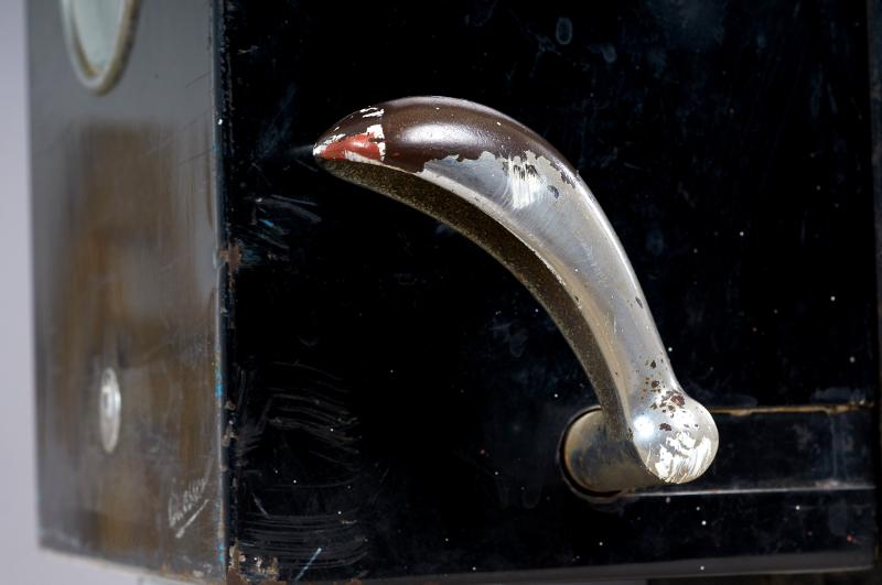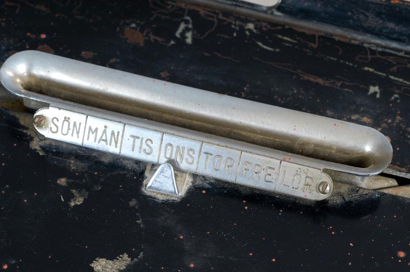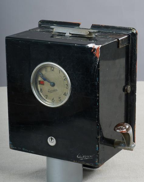 - Svart stämpelklocka i lådmodell. Klocka på framsidan som är 9,5 cm i diameter. Modellnamnet står på urtavlan samt längst ner i högra hörnet på stämpelklockans framsida. På ovansidan en skåra att stoppa ner stämpelkorten i, samt en kant där veckodagarna står förkortade till tre bokstäver.