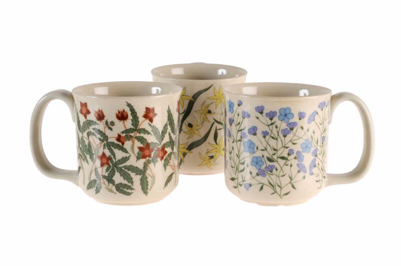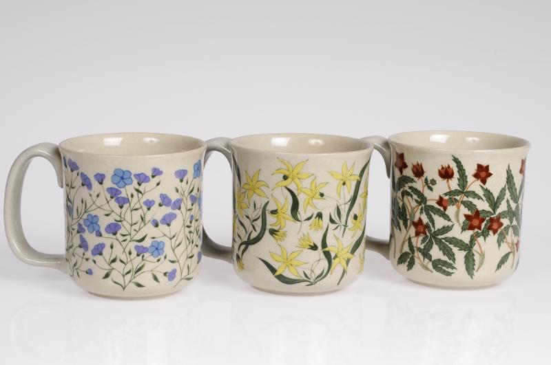 Ljusgrå, med öra som sträcker sig längs hela sidan. Blommotiv som täcker hela ytan och varje mugg har eget mönster i gult, blått respektive rödbrunt med gröna blad.