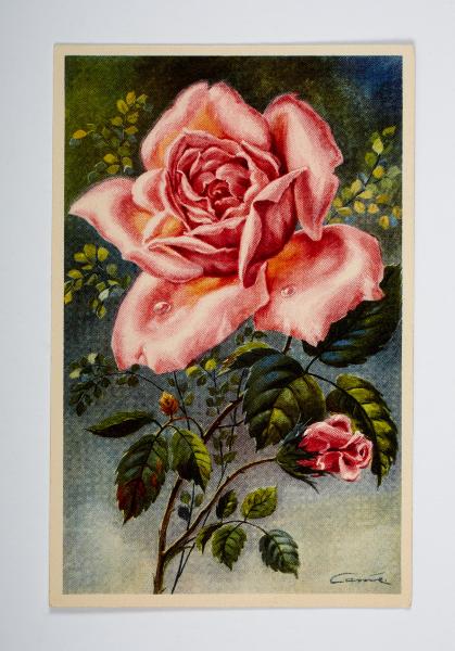 Ros och rosenknopp; födelsedagsgratulation till Anna Jansson 1954 med texten Hjärtlig Gratulation på födelsedagen fr familjen M Johansson