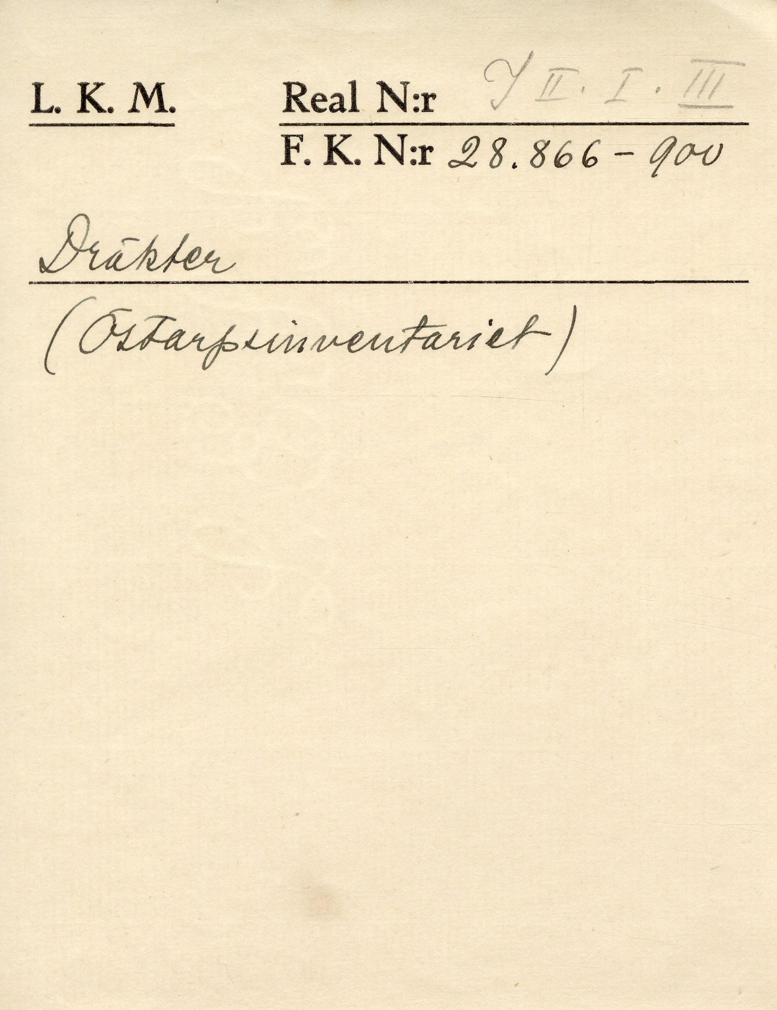 - Blå vadmal. Kraglös. Knäpps med 12 svarta knappar (2,5 cm Ø) och knapphål. Veckparti i var sida med en knapp upptill. Sprund bak, 55 cm långt, med 3 par blindknapphål. Mittsöm i ryggen. Ärmuppslag, 13 cm breda. Foder av grönt ylletyg, övre delen av ryggen med ljust linnefoder med broderat monogram och årtal "BAS 1829 Ö" i mörkblå kedjesöm. I nederkanten på fram. och baksidan finns hyskor för att fästa samman rocken då man satt till häst. Hank av skinn vid halsen. Malangripen, december 1994.