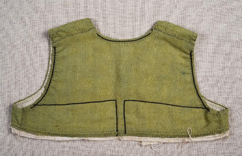 - Ljusgrönt tätt tyg. Tuskaftsbotten med små mönstervävda blommor. Dekorerad i ryggen med enkelt broderi i svart silke: rand i plattsöm som följer hals- och ärmlinjen baktill och som även bilar 7-or i ryggen. Ljust linnefoder. Varit fästad vid kjol.