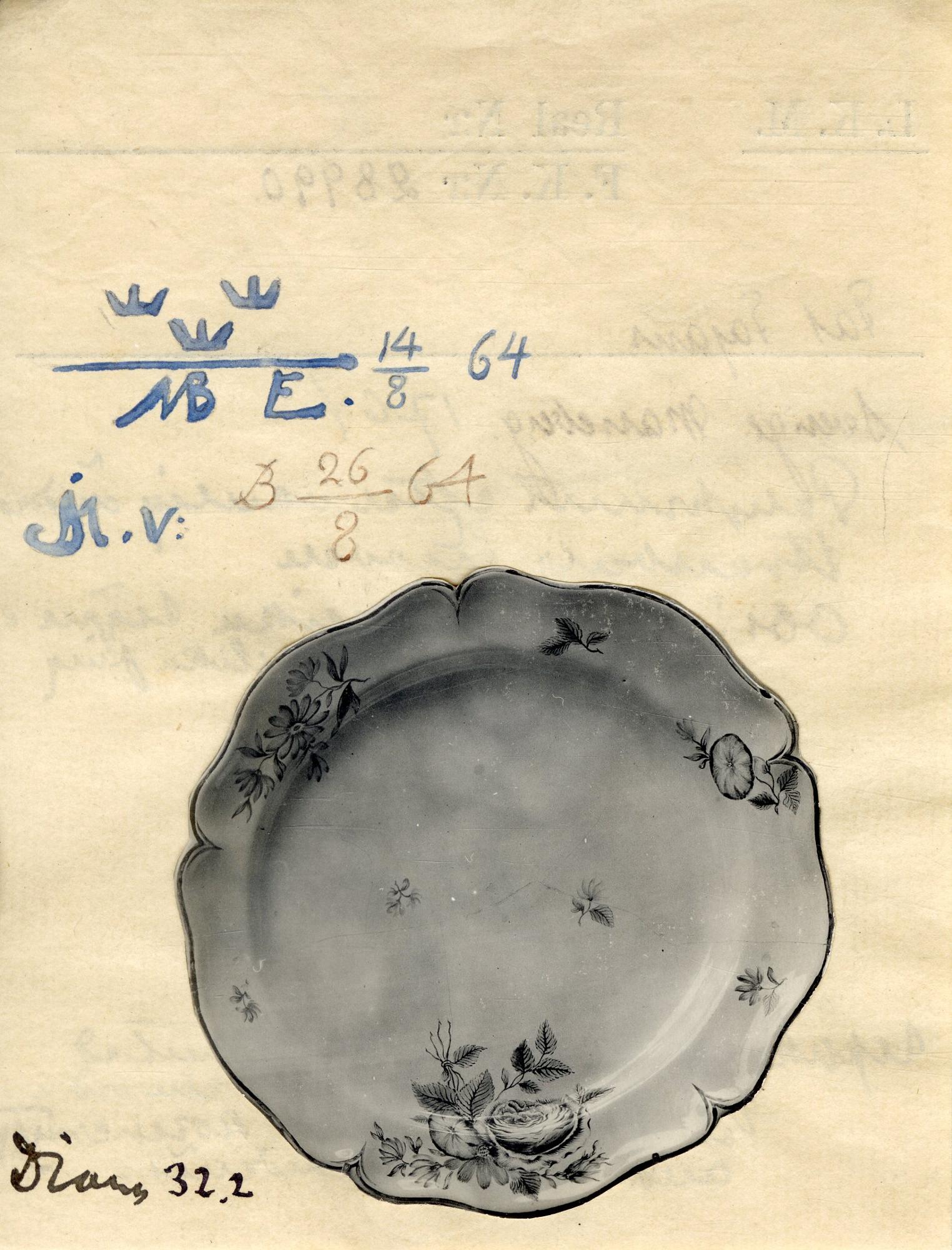 - Med fem innypningar i kanten, som är accentuerad av en linje i mangan. På brättet är målat en större och två mindre blomsterkvistar. Den större har en ros i mangan och en klart blå blomma. Den gröna färgen är svag och blågröngrå.