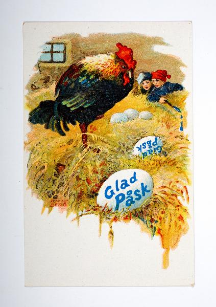 Tryckt motiv av tupp, två barn, hö, vita ägg med texten Glad påsk, signerat Kjellberg; Axel Eliassons Konstförlag Stockholm No 6088 Svensk Tillverkning. Oanvänt.