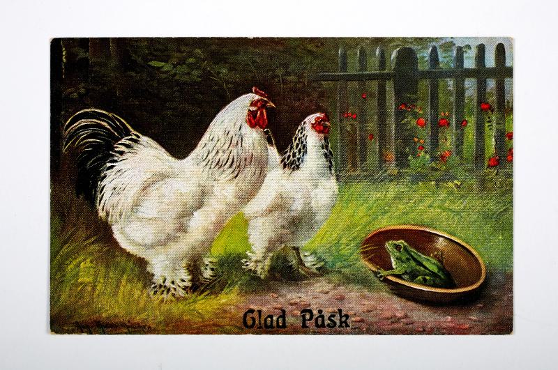 En tupp och en höna, en groda i en lerskål och texten Glad Påsk, Printed in Germany. Oanvänt.