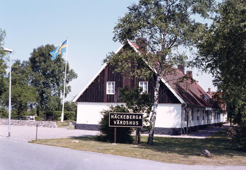 - Markbild. Häckeberga värdshus i Genarp. Sett från vägen. Till vänster stenmur, bakom denna trädgård med gräsmatta, trädgårdsmöbler, flaggstång med svensk flagga. Skylt mot vägen HÄCKEBERGA VÄRDSHUS, träd, buske. På husets långsida vid dörren ytterliggare, mindre skylt med samma text, järngryta med gula blommor.