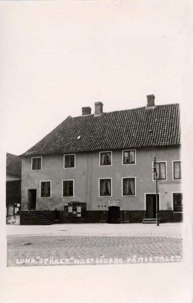 Lund, "Stäket" vid Stora Södergatan på 1900-talet. I husets källare finns Maria Olssons ost, smör & ägghandel. Avfotografering. Vykortet oanvänt.
