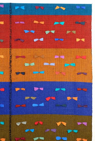 Slarvtjäll, lingarn. Breda ränder i svart, grönbrunt, blått, gult, rostrött och turkos. Hopsydd av två smalare längder. Strödda rosetter över ytan.