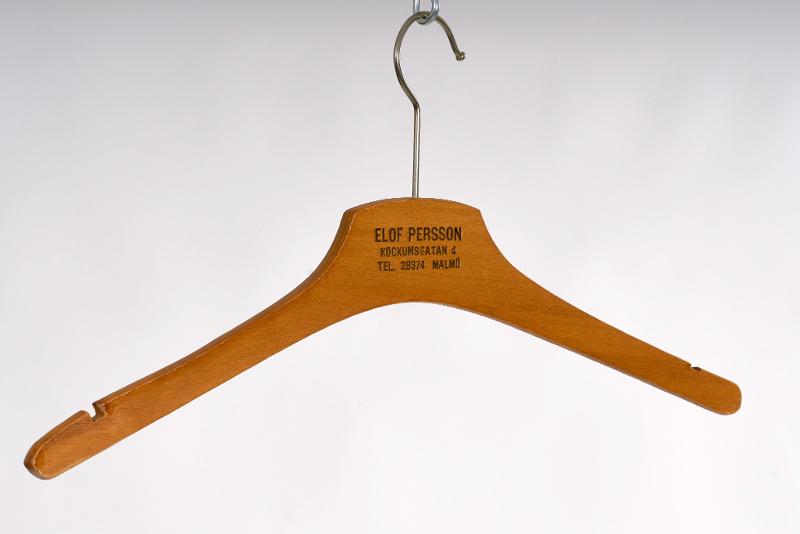 Lätt böjd, rundade ändar. Metallkrok. Olika tryck på sidorna "Elof Persson Kockumgatan 4 tel. 28374 Malmö" resp "1:a klass damskrädderi Malmö".