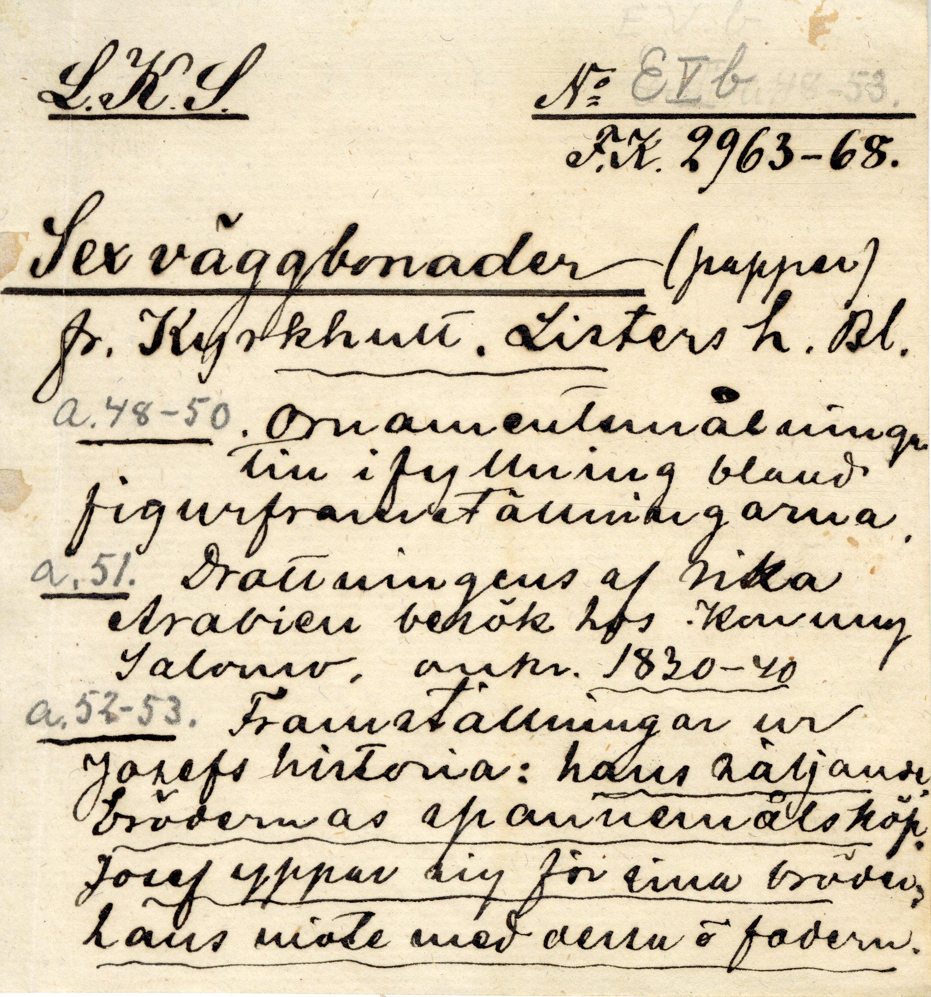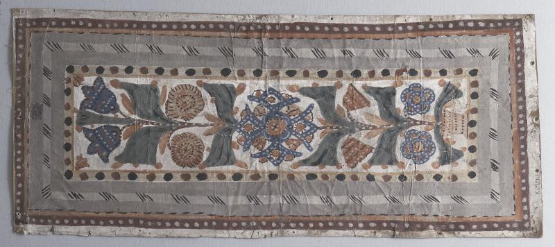 Blomsteruppsättning. Målat i tegelrött, brunrött, ljusblått, grågrönt, grått, vitt och svart. Uppmonterad på papp. Märken efter spikhål. Kanterna trasiga. Troligen målad av samma mästare som till Km 2963, 2794.