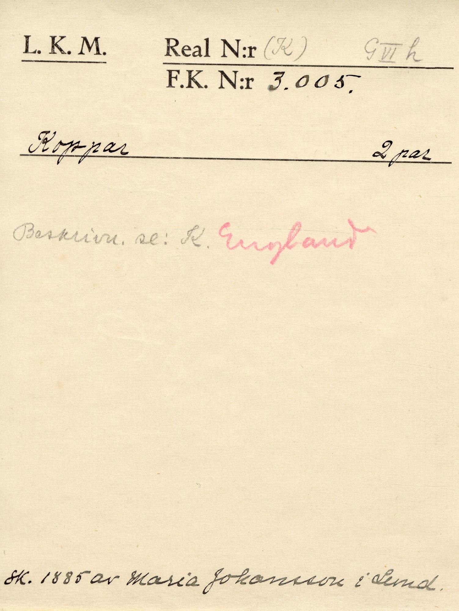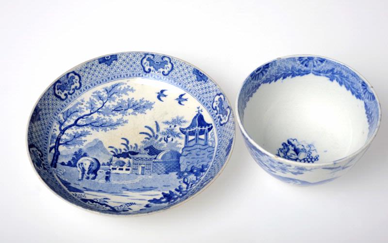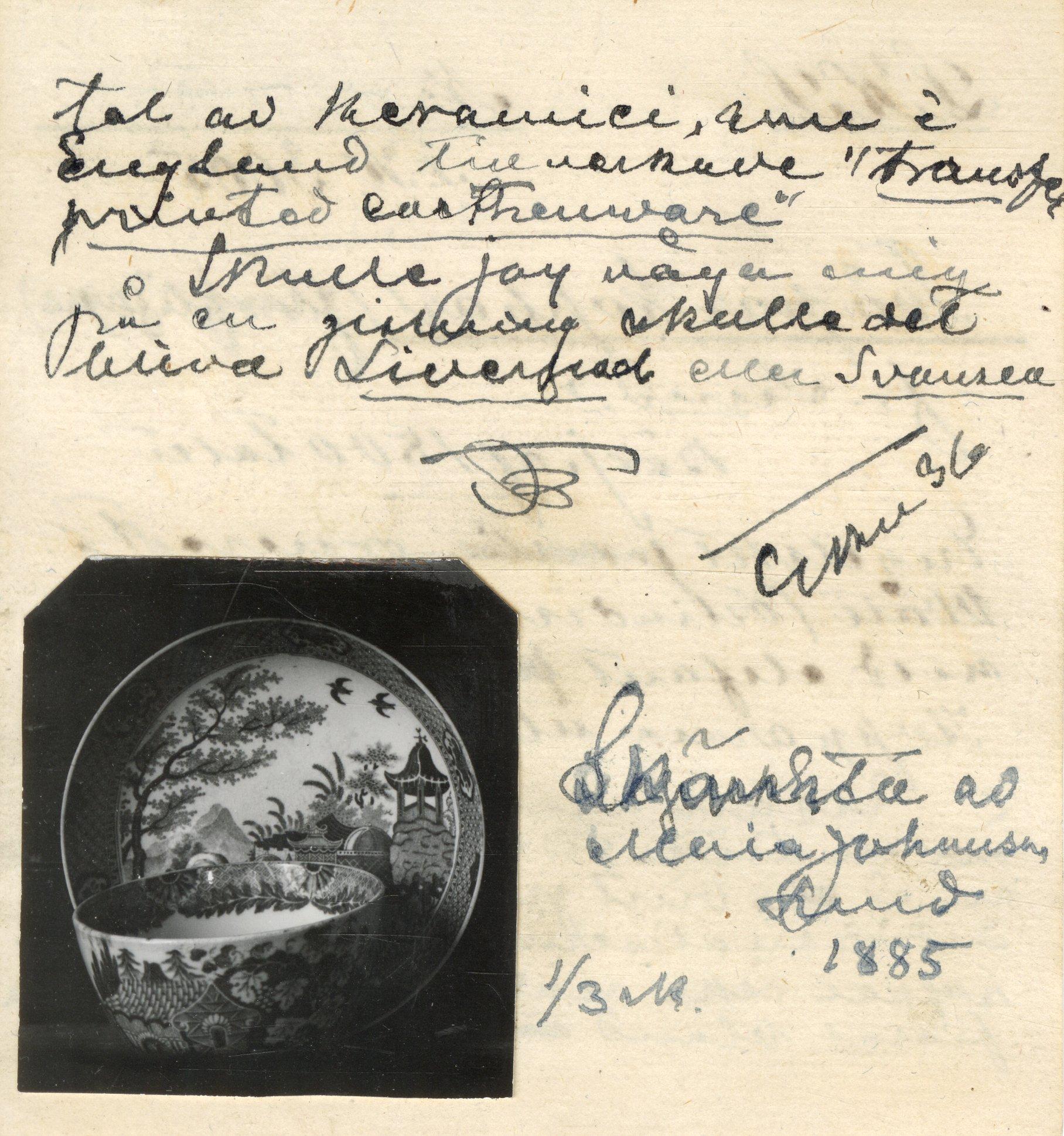 Två olika katalogkort finnes; det ena anger fabrik Rörstrand?, det andra England som tillverkningsland. Enligt det ena katalogkortet end. 1 kopp med fat, enligt det andra 2 par koppar. Rund med bukig sida. Fotring. Mönster i blå, tryckdekor föreställande japanskt eller kinesiskt par vid hus.