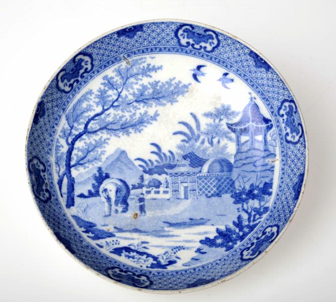 På insidan av mynningskanten blått dekorband och på koppens botten blommönster. På fatet kantbård med gallermönster omväxlande med blomsterkartuscher, på spegeln orientalisk landskapsscen med elefant.