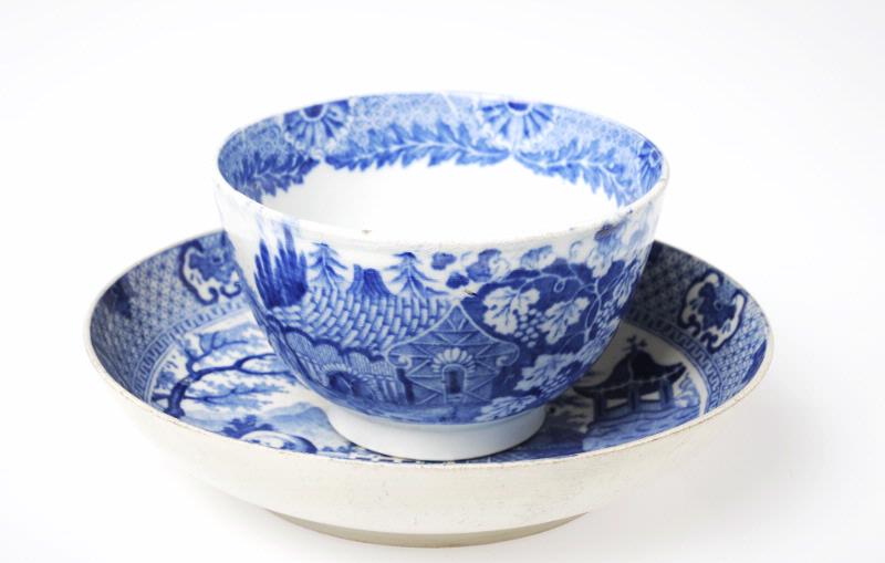 Två olika katalogkort finnes; det ena anger fabrik Rörstrand?, det andra England som tillverkningsland. Enligt det ena katalogkortet end. 1 kopp med fat, enligt det andra 2 par koppar. Rund med bukig sida. Fotring. Mönster i blå, tryckdekor föreställande japanskt eller kinesiskt par vid hus.