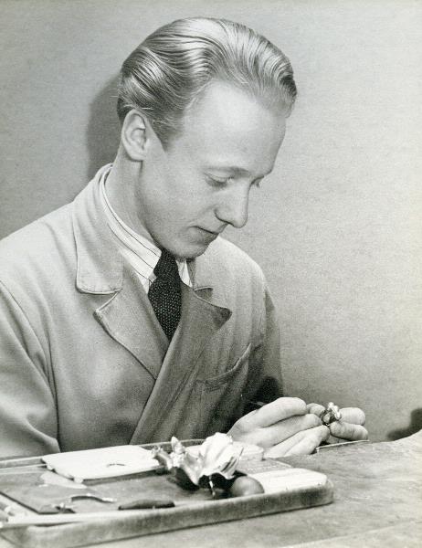 Fotografi, svartvitt; interiör från Wiwen Nilssons verkstad på kyrkogatan, Börje Nilsson arbetar med smycken