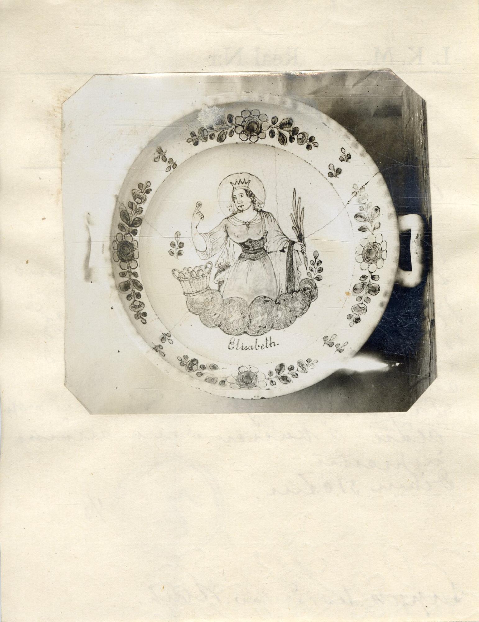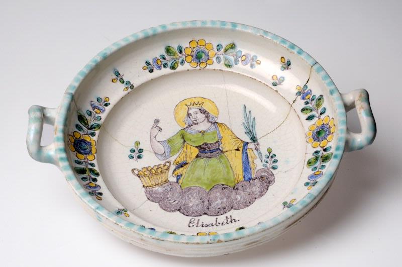 Med hänklar. Dekor i turkos, grönt, blått, gult och mangan. I spegeln bild på den heliga Elisabeth.