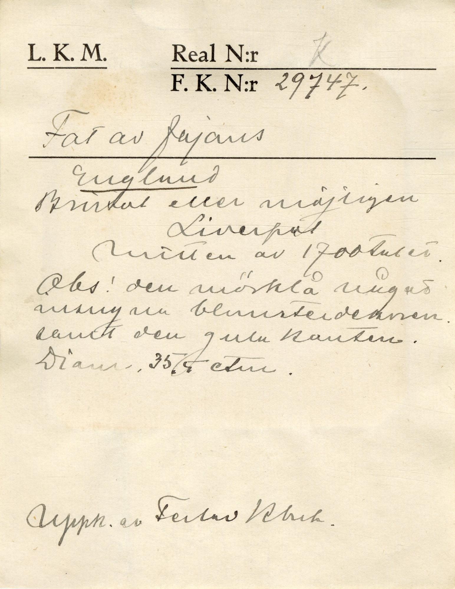 Tezt på katalogkort: Liverpool 1760 och referns till English Delftware nr 170.