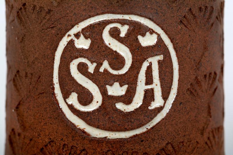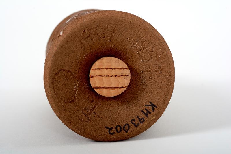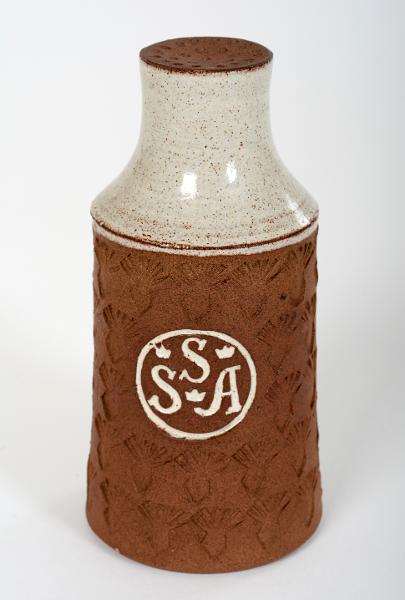Rund med avsmalnande hals. Upptill hål för strösocker, undertill påfyllnadshål. Stämplad dekor- SSA i ring. Oglaserad nedtill, vit glasyr upptill.