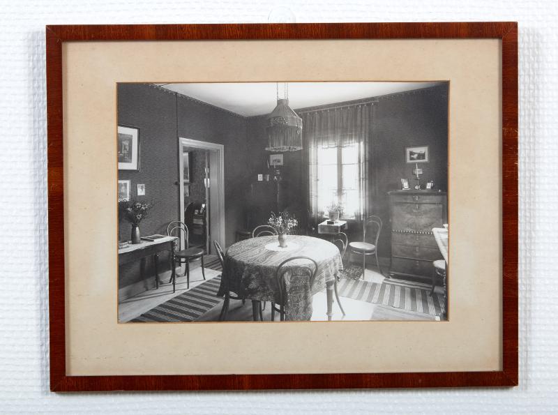 interiör från Plantagelyckan 1 (nuvarande Karl XII gatan), Lund, änkefru Johanna Mortensens hem. Matsalen med wienerstolar och trasmattor. Fotograf Emil Grothén, troligen 1930-tal.