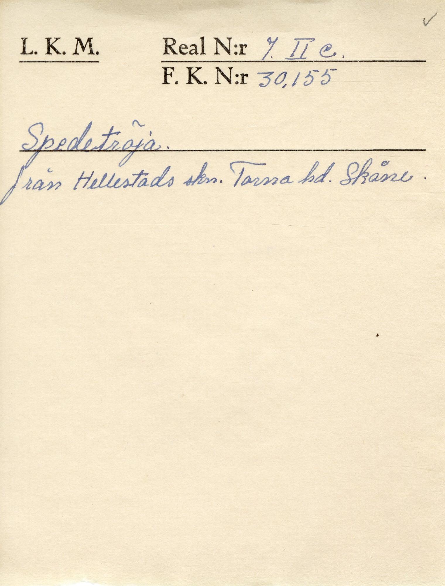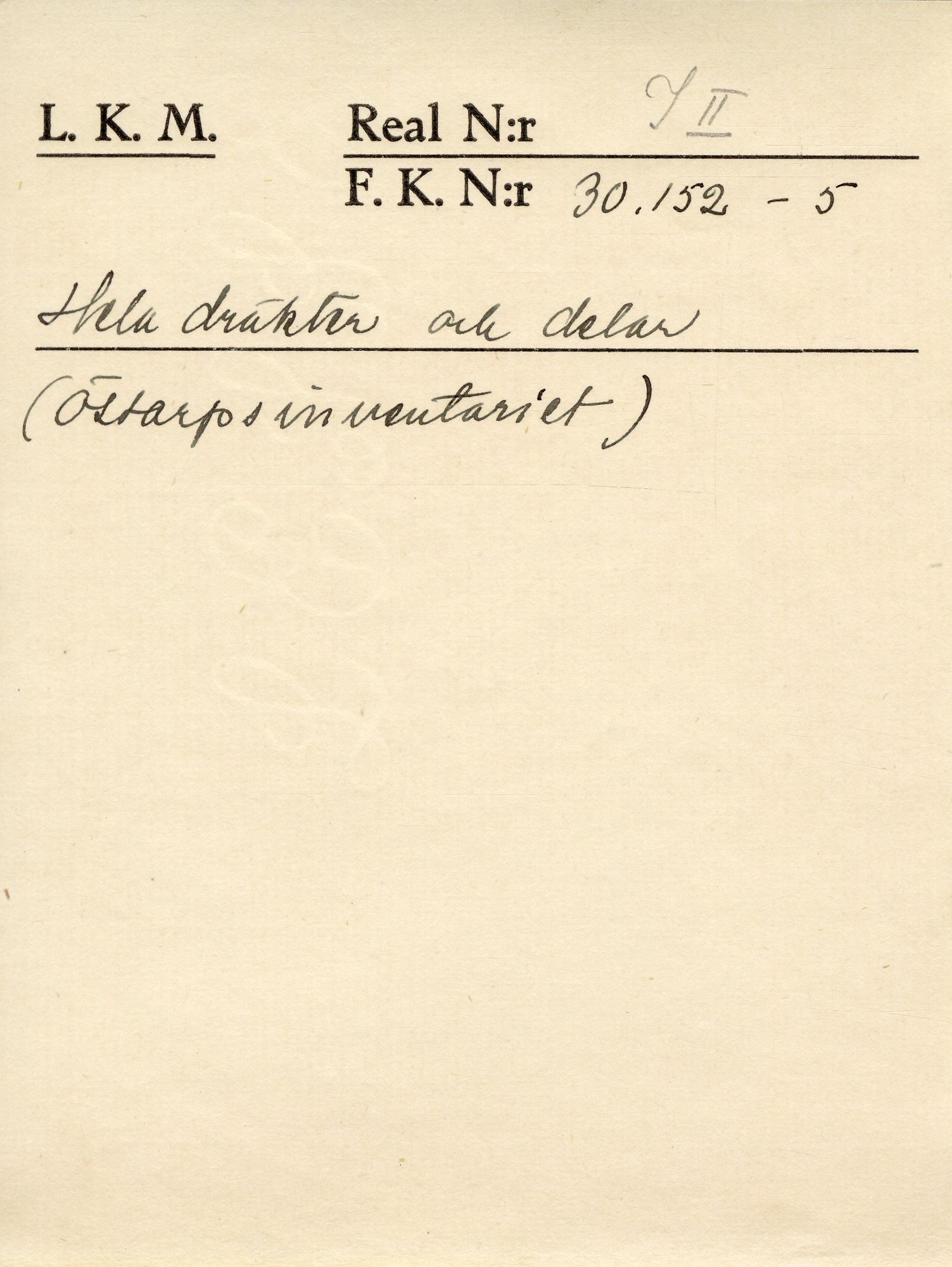 - Mörkgrön. Slätstickad. Resårstickad nederkant. Tagg och schackrutebård vid axel, ärmsöm och i sidorna (tagg endast vid ärmsöm). Sidosprund. Band av skuren sammet, grön botten svarta blommor runt ärmlinningar och hals och sprund på framsidan. Närmast halsen, runtom, grön sammet. Litet silkesbroderi, plattsöm och stjälkstygn i grönt och violett. Vid ärmlinningen både häkta, knapphål och hank med köpknapp.