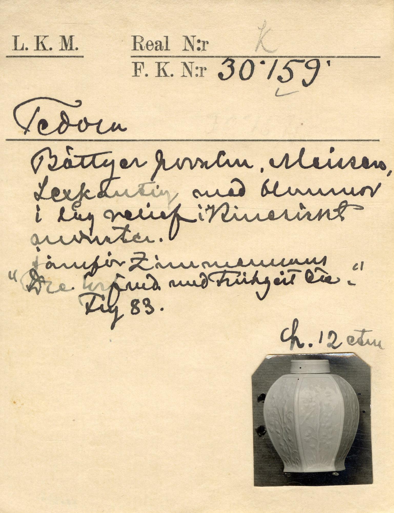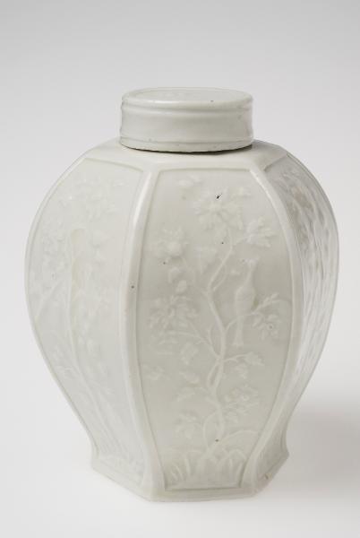 Sexkantig, uppåt vidgande med indragen skuldra. Runt, platt lock. Vitt Böttgerporslin med blommande träd och fågel i upphöjd relief, två olika motiv.