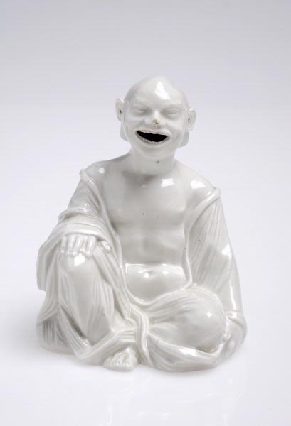 Pagodfigur. Böttgerporslin. Sittande kinesisk figur, klädd i buddhistisk munkkåpa, öppen bred mun. Ihålig med hål i mun och öron, utan botten. Vit.