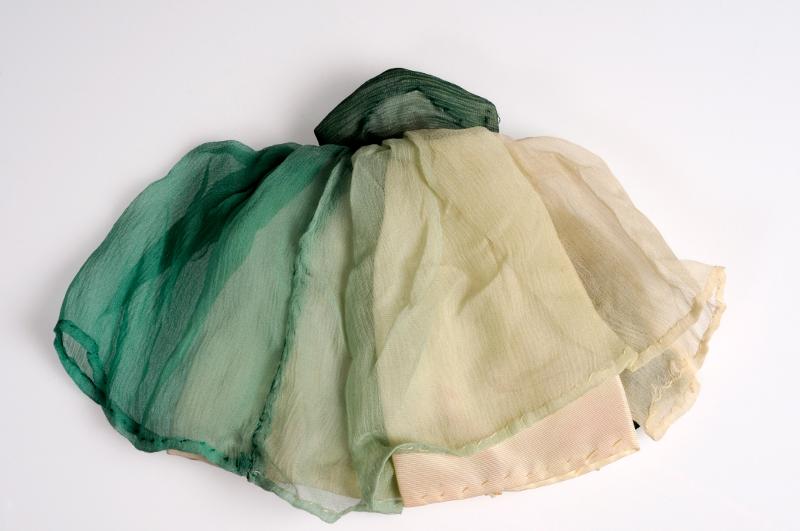 - Aftonklänning med ärmlöst och fodrat liv av chiffong. Avskuren midja, klockad kjol i två lager. Livfoder och första kjollagret i gräddfärgad syntet. Liv och översta kjollager i grön och gräddfärgad chiffong. Tryckknapp i ryggen.